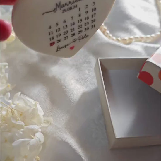 Celebrate your love with our personalized wedding calendar ornament, a timeless keepsake to mark your wedding day, anniversary, or first Christmas together. Each ornament is a 3"x 3" round, or heart shaped ceramic design, hand-pressed in our boutique and finished with a ribbon for easy hanging (ribbon style may vary).